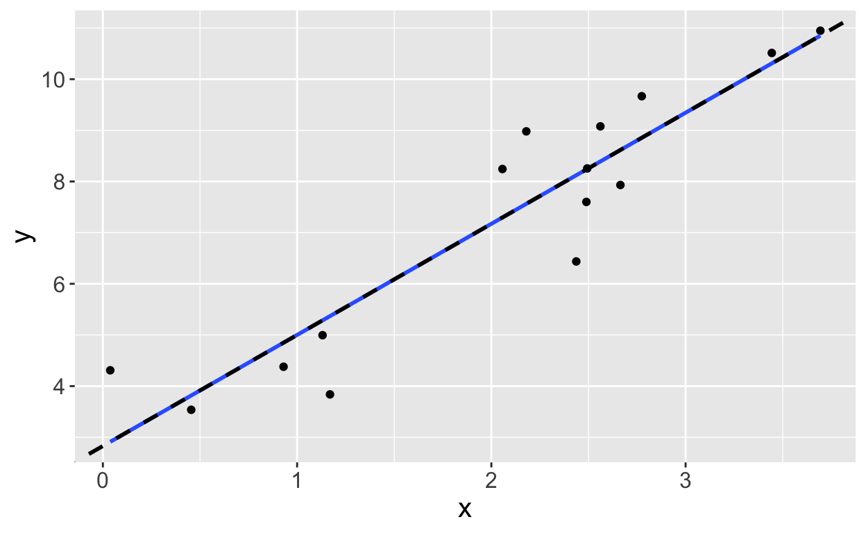 Here the dashed black line is the line with slope 2.171718 and intercept 2.8290509. It perfectly matches what we previously stated was the best fit line.